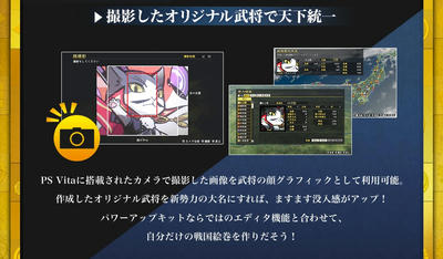 撮影したオリジナル武将がゲーム内で武将の顔グラフィックとして使用できます。パワーアップキット版のエディタ機能と組み合わせて、オリジナルの武将でゲームに没頭!